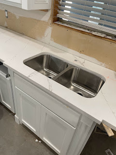 The induction cooktop was also installed for the same reason. I had asked Donell early in the reno process if we could choose how we wanted our counters edged. The ones in College Station were rounded. The ones in our rental are rounded at the corners. I really just wanted a clean, square cut edge. When we found out we were getting quartz, I asked about the edging and Donell said they didn't give us an option. So we were going to be surprised. I was thrilled to see that it was exactly what I was hoping for, straight and squared off. I also really liked how they followed the pattern of the cabinets around the cooktop and sink. It adds real depth and unique design. I wish we could do without two seams where the quartz pieces were sealed together, but what can you do?